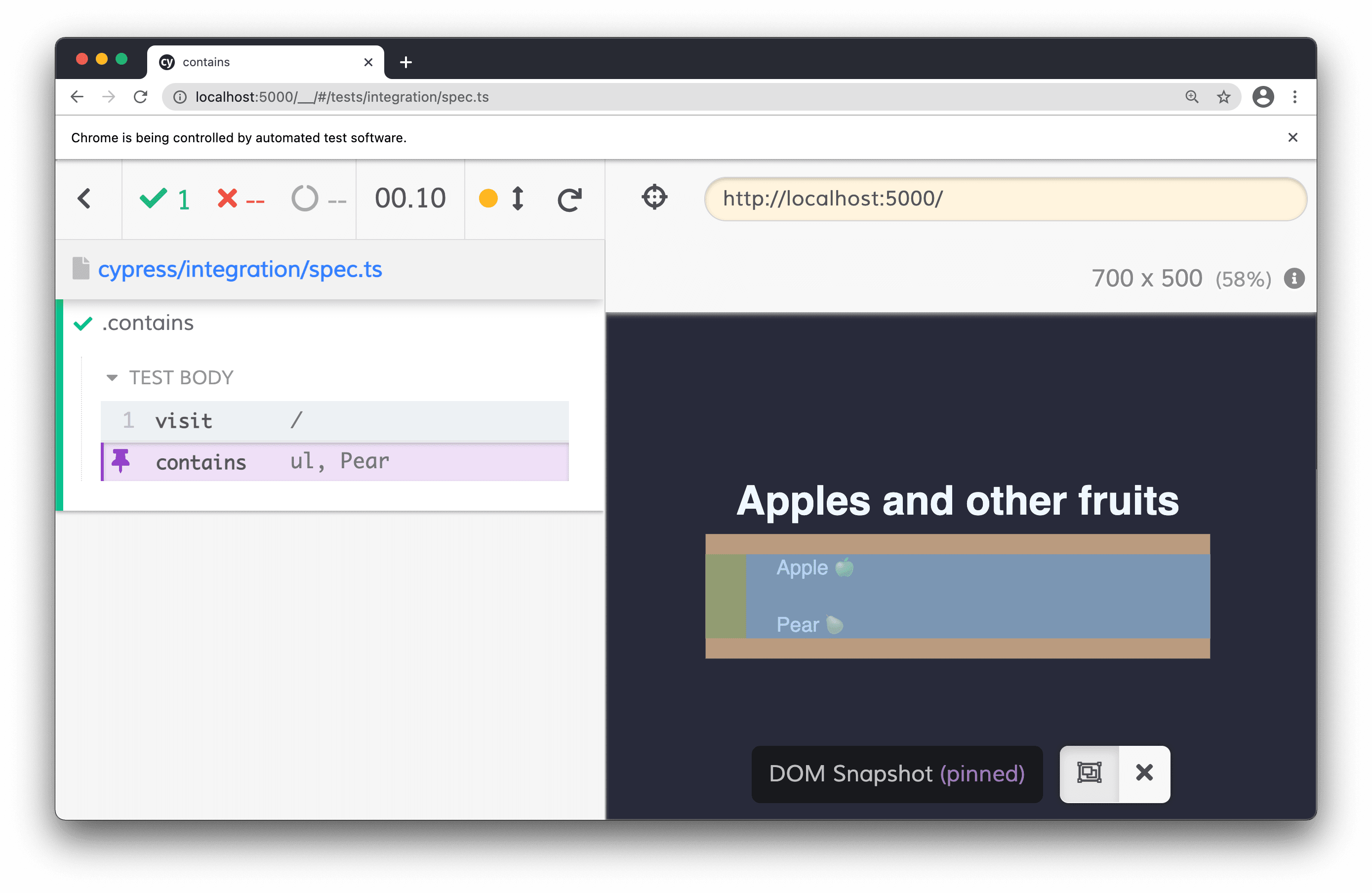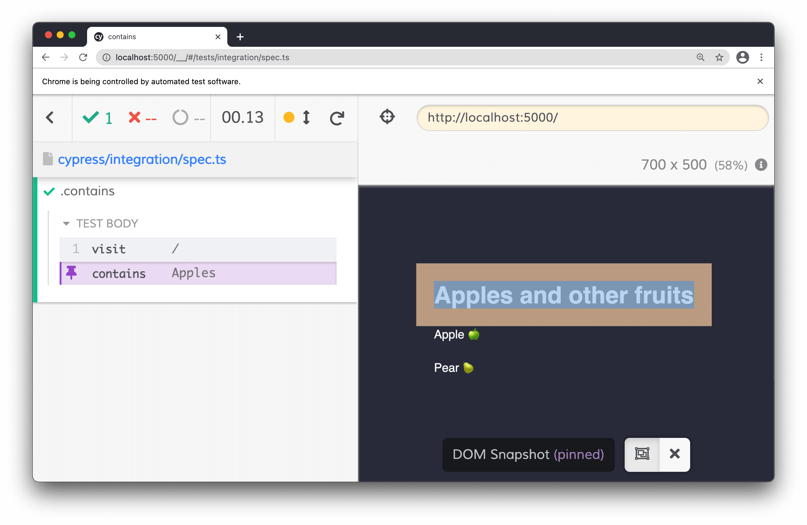 Bear in mind, that if I just used Apple as a text, the result would be different, since Apple appears twice on our page. By default .contains() will search the whole DOM, and return the first element with matching parameters. If you have multiple elements with the same text, you will need to scope the search,