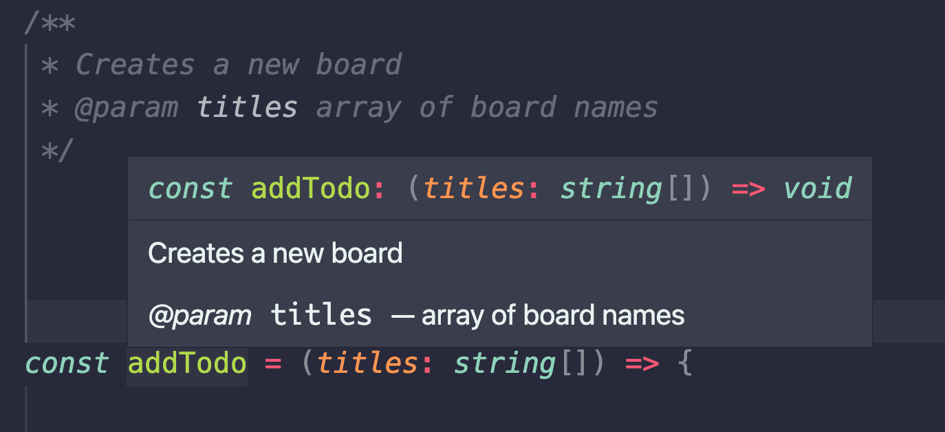 There’s another cool TypeScript feature, which you can use even with pure JavaScript. With JSDoc, you can add documentation to your functions. In VS Code, you can add your documentation by typing /** */. This will create a special comment, that will pop out once you hover over your function.